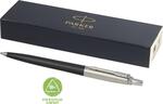 The Parker Jotter Recycled ballpoint pen offers sustainability, style, and performance at an affordable price. Its scratch-free recycled plastic body combines elegance with durability. Including Parker Quinkflow® refill for a smooth writing experience lasting 3500-5500 metres. The trim ring made from recycled stainless steel enhances its eco-friendly appeal. The Jotter Recycled Ballpoint Pen is ideal for budget-conscious, eco-conscious individuals who seek a stylish and sustainable writing instrument. Black ink. Recycled Plastic, Recycled stainless steel.